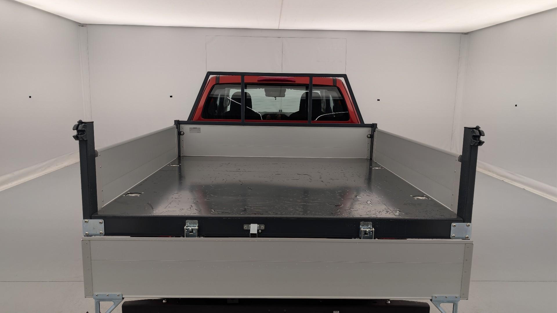 • Heckkipper aus Stahl: Ladeflachenkonstruktion aus Stahlblech, Starke 3 mm 3 mm Stahl-Hilfsrahmen 300 mm Aluminium-Front mit lackierter Stahl-Leiterhalterung 300 mm Seitenwande aus eloxiertem Aluminium mit integrierten Offnungsgriffen 300 mm Heckwand aus eloxiertem Aluminium Verschraubte Heck- und Frontpfosten Auf dem Boden eingelassene Zurrosen (2+2) Kotflugel aus Thermoplast Werkzeugkasten Elektropumpeneinheit mit Steuergerat in der Kabine, Batterietrennschalter, Sicherheitssicherung und akustischer Warnvorrichtung Verschleiss-, witterungs- und rostbestandiger verchromter Teleskopzylinder mit Sicherheitsmagnetventil Unterfahrschutz und Vorrichtung fur zugelassene Anhangerkupplung Kataphorese-Behandlung und Pulverbeschichtung Beleuchtung gemass Code